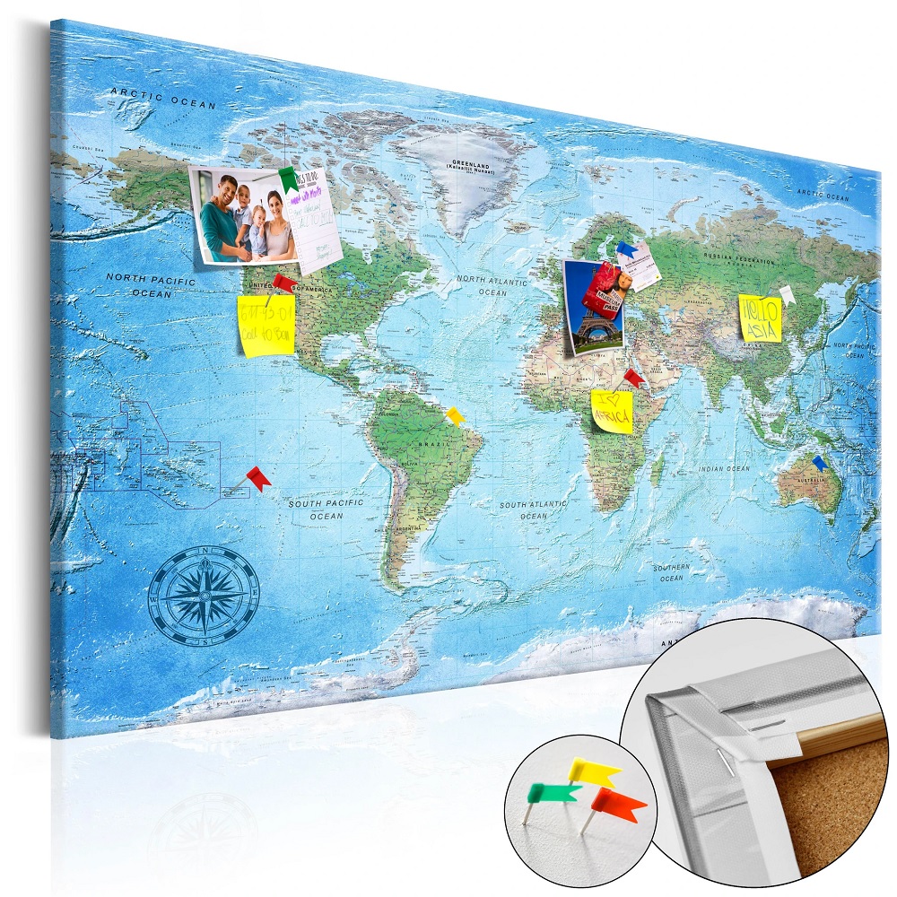 Beim Anblick dieser Weltkarte Pinnwand wäre der englische Gentleman Phileas Fogg aus dem berühmten Roman von Jules Verne sicher neidisch gewesen. Das dekorative Korkbild hätte sich wunderbar geeignet, um die einzelnen Stationen seiner 80-tägigen Reise um die Welt mit den mitgelieferten Fähnchen für die Ewigkeit festzuhalten.